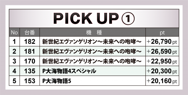 合計ptでプラスに届かなかった『エヴァ15』はトップ3を占めたものの、最も高い182番台でも+2万7千弱と、以前の出玉データに比較すると正直少なさを感じる結果なのは残念だった。