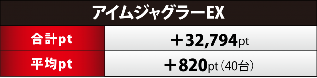 ここ数回では最多となる+3万2千超の合計ptを弾き出したのが『アイムジャグ』40台。プラス率は70%(28台)と高水準、1,000overは20台&+3千超×3&+2千超が6台と、優良台が豊作という状況となった。
