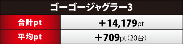 『ゴージャグ』20台も+1万4千超の合計ptを計上。こちらのプラス率も65%(13台)と上2つに匹敵、1,000overは8台、+2千超が5台と、突出した差枚数の台はなかったが、全体的にはハイレベルと言っても過言ではなかった。