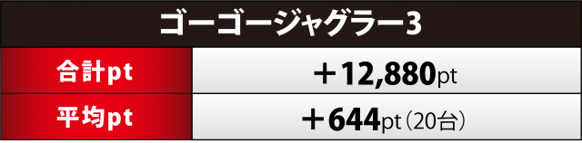 4つの中で最も高い合計ptとなったのが『ゴージャグ』20台。プラス率は55%(11台)と半数超、抜きん出た好調台はなかったが、1,000overは10台&+2千超が5台という結果となった。