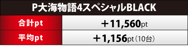 『大海4SP BLACK』10台も合計ptで+1万1千超に至った。プラス台の割合は60%(6台)と上2機種を飛び越えたが、プラス5桁は149番台の+1万9千超のみと、もう少し大量獲得台が欲しかった。