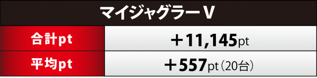 『マイジャグ』20台は+1万1千超の合計ptを達成。プラス率は55%(11台)と半数をクリアし、1,000overは7台、最高値は868番台の+3千2百弱だった。