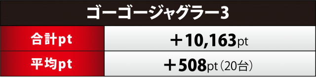 『ゴージャグ』20台もギリギリでプラス5桁の合計ptに食い込んだ。プラス率はこちらも55%(11台)と半数を超え、1,000overが6台、+3千超×2と、充分に闘いやすいエリアであったことが示されている。