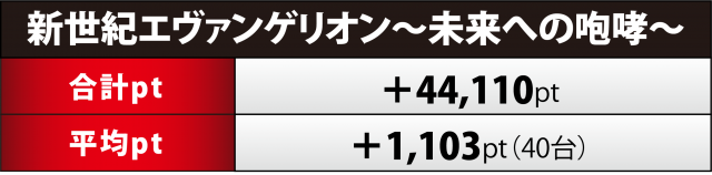 『エヴァ15』40台は+4万4千超の合計ptで終了。プラス率は45%(18台)と半数近くに迫り、+3万超が2台&+2万超が4台と、大量獲得が複数生じた。