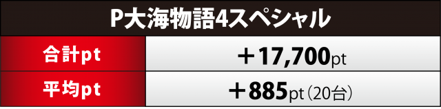 『大海4SP』20台は+1万8千弱の合計ptに到達。プラス台の割合は45%(9台)と半数には及ばなかったが、シマで最優秀の149番台が+2万超の数値を刻んだ。