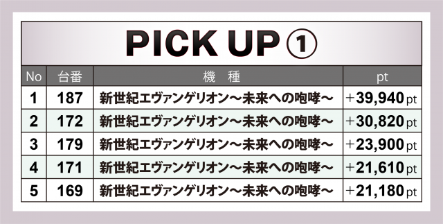上に挙げた以外では『Pやじきた道中記』501番台の+4万1千弱、『Pゲゲゲの鬼太郎 獅子奮迅』493番台の+3万7千超、『P新世紀エヴァンゲリオン〜未来への咆哮〜SPECIAL EDITION』600番台の+3万7千弱、『Pフィーバー 機動戦士ガンダムユニコーン』205番台の+3万3千弱、『スマートぱちんこ ソードアート・オンライン』259番台の+3万1千弱と、メイン4機種にも負けないスコアとなった。