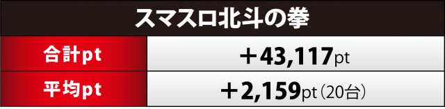 直近数回の調査ではハイクオリティを維持し続けているのが『スマスロ北斗』20台。今回最大の合計ptとなる+4万3千超を成し遂げ、1台あたりの平均ptが4桁かつ+2千超となり、6機種の中でも群を抜いたレベルの高さを実現した。