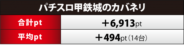 『カバネリ』14台は+7千間近の合計ptに。プラス台の割合は約63%(9台)、1,000overは4台、最優秀の1026番台が+4千超、他にも+3千6百超が1台と、上記5マシンに負けず劣らずの数値となった。