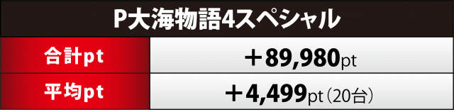 今回+9万寸前の合計ptとなった『大海4SP』20台。130番台の+2万9千弱がトップと極めて高い差玉の台はなかったものの、プラス台の割合は60%(12台)・5桁プラスが8台と高い安定度を誇った。