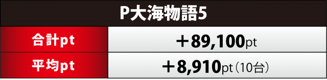 『大海5』10台も『大海4SP』と同等の合計ptとなったが、設置が少ない分平均ptは倍近くの数値となった。全体の7割となる7台がプラス、うち5台がプラス5桁、中でも154番台が+4万9千弱のビッグヒットとなった。