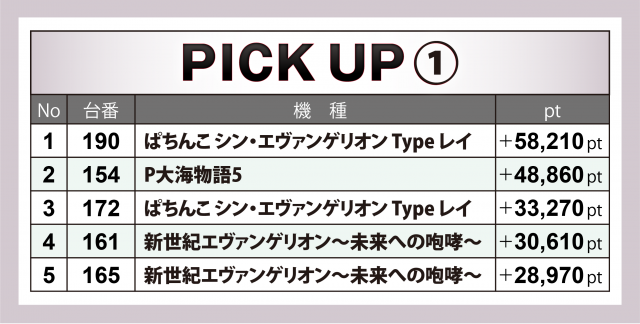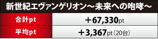 『エヴァ15』20台は合計+6万7千超、平均pt+3千4百弱となった。プラス率は55%(11台)と半数強、5桁プラスは7台、コーナーでツートップの161&165番台は+3万1千弱&+2万9千弱、看板5機種によるトップ5でも4・5位に食い込んだ。