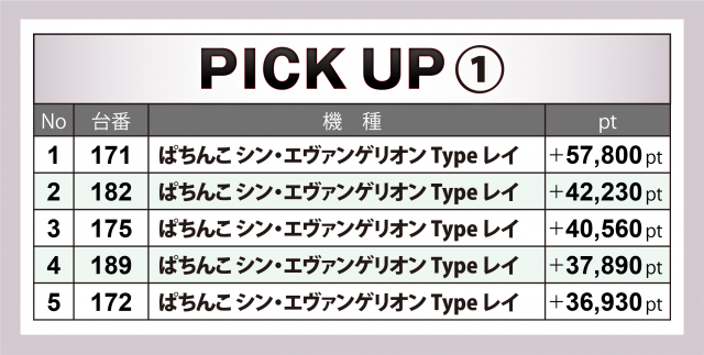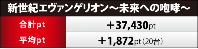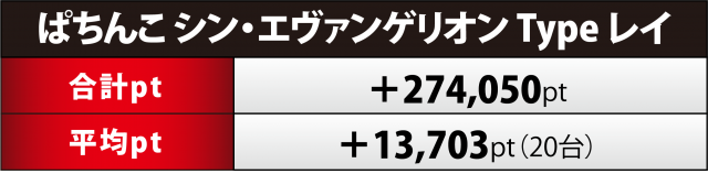 『エヴァ15』20台はトータル+3万7千超で、平均ptを4桁で結んだ。こちらもプラスは11台と『大海4 SP』と同数字、5桁のプラス差玉は6台、その中で+2万オーバーは3台となった。