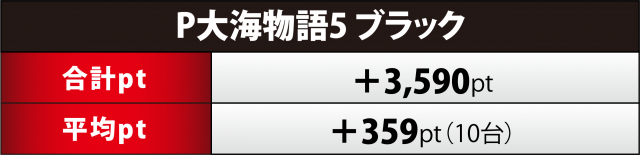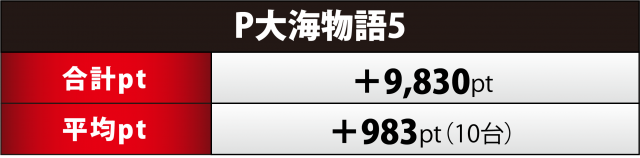 『大海5』10台の合計ptは惜しくも+1万を切った。ちょうど半分の5台がプラス、156番台が+2万1千オーバー、もう1台が+1万5千超で続いた。