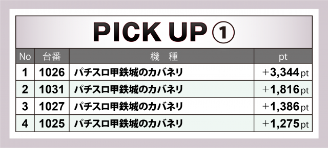 『カバネリ』14台は6機種で唯一トータルプラスに失敗。プラス台の割合が約36%(5台)と低かったのがその原因だろう。しかし上表の4台が1,000overを成就し、ナンバーワンとなる1026番台が+3千3百超と、歯が立たない状況ではなかったことが分かる。