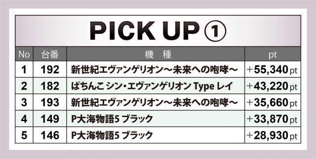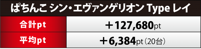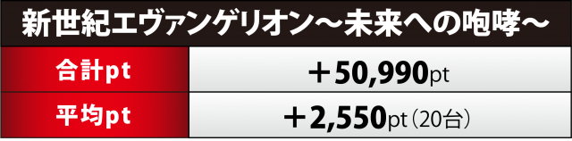 『エヴァ15』20台は合計+5万1千弱の合計ptで勝利。プラス率は40%(8台)と半数には届かなかったが、プラス5桁は4台、192番台が+5万5千超で4パチ全体でも王座に輝いた。