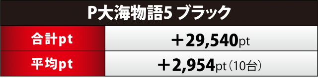 『大海5ブラック』10台はトータル+3万弱を達成。プラスは4台と全体の4割、5桁のプラス差玉は2台、149番台が+3万4千弱&146番台が+2万9千弱で両者共に4パチ全体の上位10台にランクインした。