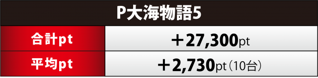 『大海5』10台の合計ptは+2万7千超で終了。ちょうど半分となる5台がプラス、154番台が+2万3千オーバー、さらに159番台が+2万3千弱で続いた。