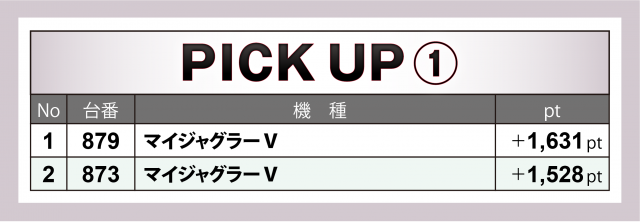『ゴージャグ』20台はなんとか4桁の数値で合計ptをプラスに終えた。プラス台の割合は40%(8台)と半数を割り込んだものの、1,000overは5台、コーナートップの938番台は+3千7百弱、その他にも+3千超と+2千超が1台ずつと健闘を果たした。