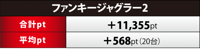今回シリーズ4機種の中で唯一5桁を超える合計ptを残したのが『ファンジャグ』20台。全体の65%となる13台がプラス・1,000overは7台、+3千超が1台だったが、+2千を超える台がなかったことで少し伸び悩んだか。