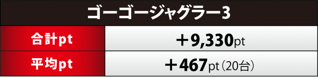 『ゴージャグ』20台は『アイムジャグ』に迫る合計ptとなったが、台数が少ない分平均ptでは上回った。プラス率は70%(14台)と上2機種より高く、1,000overは6台、+3千超&+2千超が1台ずつとなったが、こちらでも抜きん出た差枚数の台がなく、いつもと比較するともう一歩の感が強かった。