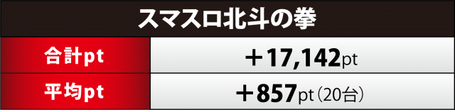 前回6機種で最も多い合計ptを達成した『スマスロ北斗』20台。今回はそれには届かなかったが+1万7千超で今回も首位に輝いた。プラスは12台と全体の6割に達しジャグラーシリーズに匹敵、1,000overは8台となった。