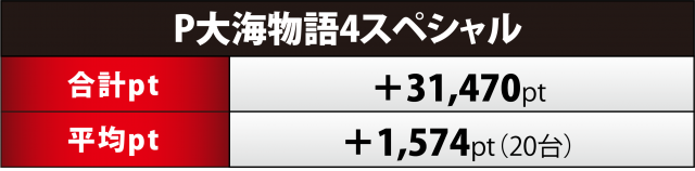 『大海4 SP』20台も+3万1千超の数値で勝利に成功。プラスは9台と全体の半数には届かなかったが、5桁のプラス差玉となったのは7台と高水準、うち+2万超が2台と、勝負に値するコーナーだったと言える。