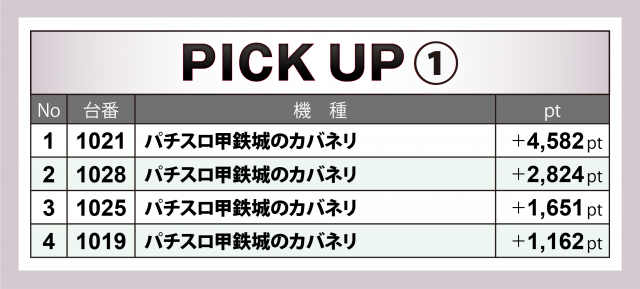 『カバネリ』14台は機種全体ではプラスを逸した。プラスが5台と全体の3割超であったことがその原因だろう。一方1,000overは上表の4台で、最も出ていた1021番台が+4千6百弱、1028番台が+2千8百超と、勝機が秘められていたことが伝わってくる。
