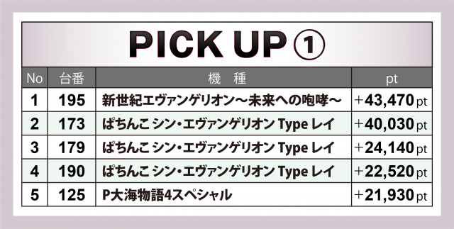 連日高い着席率と大量出玉台を連発しているのが5つの機種。『ぱちんこ シン・エヴァンゲリオン Type レイ』『P大海物語4スペシャル』『P大海物語5 ブラック』『P大海物語5』『新世紀エヴァンゲリオン~未来への咆哮~』だ。