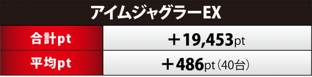調査3回連続でジャグラー4機種の首位に輝いたのが『アイムジャグ』40台。全体の6割となる24台がプラスを達成、+3千超×2&+2千超×3が上位5台となり突き抜けて出ている台はなかったものの、1,000overが12台と2桁を超えており、今回の最終合計に波及した。