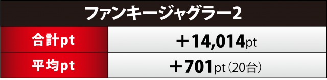 『ファンジャグ』20台も前回に続いてトータルptで2位をキープ。プラス台の割合は60%(12台)、4桁プラスは8台、+3千超が3台&+2千超が1台となったが、さらに飛び抜けた成績があればなお良かった。
