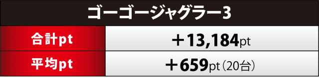 『ゴージャグ』20台は前回を+5千近く上回る合計ptで終了。勝率は60%(12台)と上2機種と同数・1,000overは8台とまずまずだったが、こちらも上位3台が+3千には届かなかったため、もうひと伸びには至らなかった。
