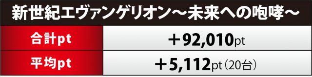 『エヴァ15』20台の合計は+9万超を計上。前回と同じく1台あたりの平均は+5千をマークした。全体のちょうど半分となる10台がプラスに終わり、+1万オーバーに達したのは6台。その中で+3万超を2台輩出した。