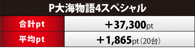 『大海4 SP』20台は+4万に迫る合計pt数を獲得。プラスになったのは9台と全体の半数に及ばず、5桁プラスを達成したのは4台と少なめ。だが、125番台が+3万5千弱という一撃を放った。