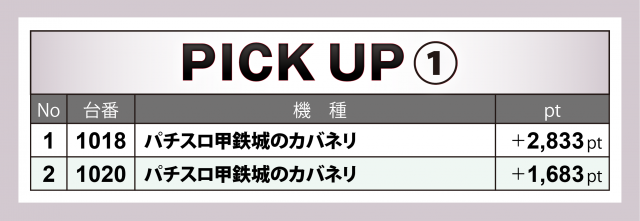 『カバネリ』14台は悔しいことに今回も合計ptでマイナス。勝利を得たのが3台と全体の2割強だったことが痛かった。また4桁プラスは上表の2台に留まったことも喜ばしくなかった。