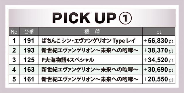 メイン5機種によるトップ5では、トータルプラスを逃した『Type レイ』191番台が+5万7千弱のビッグヒットで気を吐いた。また共に合計ptでマイナスだった『大海5ブラック』『大海5』でも5桁のプラス台があったことを追記しておきたい。