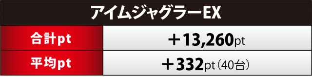 『マイジャグ』20台は+4千超の合計ptで終了。勝率は50%(10台)と『アイムジャグ』と同率・871番台が+3千5百弱と光るスコアを果たしたが、1,000overは5台と少なめだったことが全体に影響した。