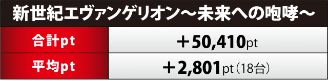 パチンコ5機種で最も多い合計ptをマークしたのが『エヴァ15』だが、こちらは前回の調査から2台減り計18台となった。プラスは12台と全体の3分の2を占有、+1万オーバーを超えたのは4台、その中では196番台が+2万9千弱でメイン5機種によるトップ5にも食い込んだ。