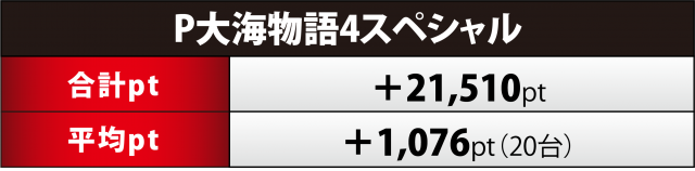 『大海4 SP』20台は1台あたりの平均が4桁となる数値でフィニッシュ。プレイヤーの勝利となったのは9台(約45%)と半数弱だったが、+1万オーバーに達したのは2台と少なかったのは悔しかった。