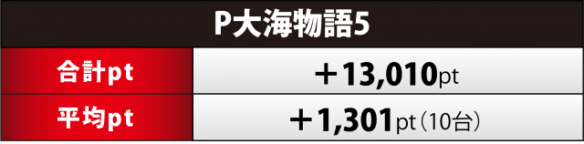 『大海5』10台は『大海4 SP』に合計ptでは及ばなかったが、設置台数が少ないため平均ptでは上回った。プラスは5台で全体の半数、157番台が+2万超&159番台が+1万8千超で機種トータルプラスに寄与した。