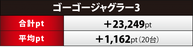 4機種の中で唯一トータルで+2万超の合計pt&1台あたりの平均が4桁プラスとなったのが『ゴージャグ』20台。プラスは14台と全体の70%、1,000overは11台と2桁超え、937番台の+4千3百超を筆頭に、+3千超が1台&+2千超が5台と、店内でも有数の盛り上がりとなった。