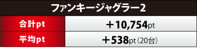 『マイジャグ』20台は+1万2千弱となる合計ptをマーク。勝利を収めたのは13台と全体の3分の2弱だったが、4桁プラスは8台&+3千2百超・+2千4百超が1台ずつと、上位陣に更なる伸びがあればより良かった。