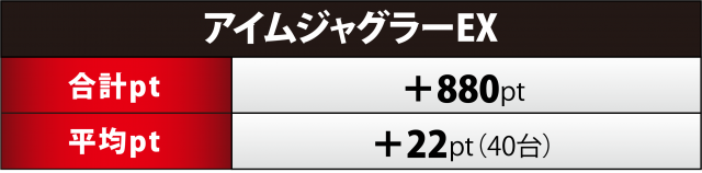 前回に続いて『アイムジャグ』40台はなんとか全体でプラスになるのが精いっぱい。プラス率が35%(14台)と半数を割った上に4桁プラスは8台と少なめ、また当コーナーでは+3千の壁を超える台がなかったことが全体に影響した。