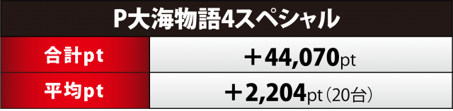 +4万4千超の合計ptとなったのが『大海4 SP』20台。プラスとなったのは9台と半数を切り+1万超は3台と双方少なめであったが、マイナスになった台も大きく沈んでいなかったことが最終数値に繋がった。