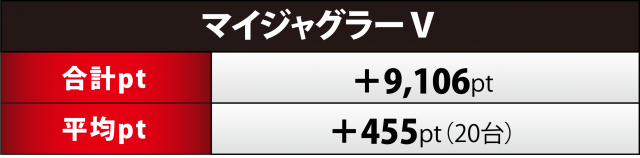 『マイジャグ』20台はプラスだったが惜しくも5桁に届かなかった。勝利を得たのは12台と全体の6割となり上3機種より少なかったことが合計に響いてしまった。しかし、869番台が+4千超&873番台が+3千9百超となる飛び抜けた一撃を放ち、他にも+2千超が1台となった。