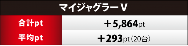 『マイジャグ』20台は+6千目前で終了。プレイヤーの勝利は15台と全体の4分の3を占める割合で高かったが、プラス4桁は4台と少なめ、シマトップでも+2千6百超ともうひと伸びが欲しかった。