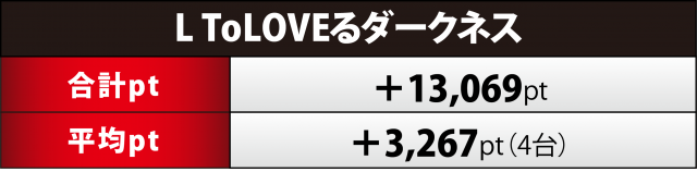 導入間もない『ToLOVEる』4台も合わせて5桁のプラスを計上。3台が勝利となり、707番台が+6千弱となった上に+4千3百超&+3千超が1台ずつと、いずれも上質な結末に。