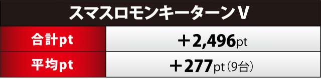 『モンキーターンⅤ』の合計ptは+2千5百弱、プラスが2台と、一見では他マシンには及ばない度合いと思われたが、743番台が20スロ全台でナンバーワンとなる+1万3千超の一撃で機種全体をプラスに押し上げた。