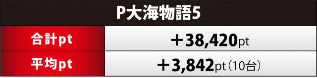『大海5ブラック』10台はなんとかプラスを守り抜いた。勝利は4台と過半数割れでありプラス5桁も1台のみだったが、その142番台が+3万5千超とライトミドルスペックらしからぬ大量獲得を招いた。