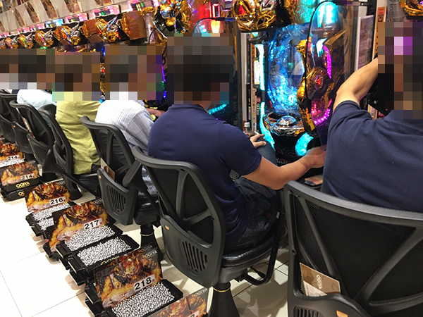 開店直後は前日とおなじく、4円パチンコの「CR牙狼GOLDSTORM翔」と「CRアナザーゴッドハーデス アドベント」、20円パチスロの沖スロが人気を集めていた。