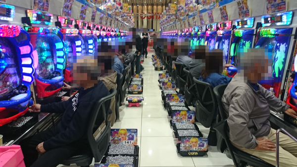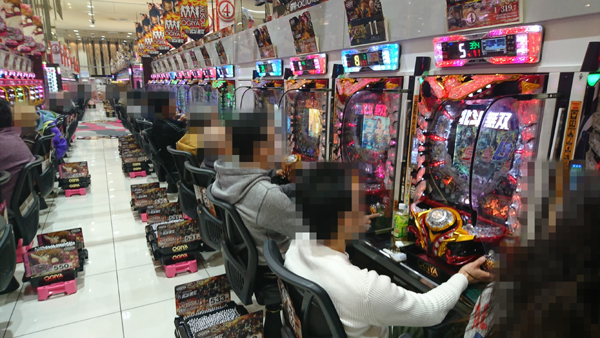15時頃の4円パチンコを見てみると、朝イチから盛り上がりを見せていた「ぱちんこCR真・北斗無双」と「CR大海物語4」が引き続き大盛況。シマ全体にプレイヤーの笑顔が広がっており、満足度の高い遊技がおこなえていたようだ。